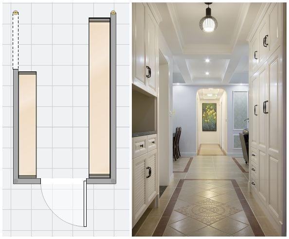 較寬的走廊,可以根據(jù)需求,可以放讓空間顯得寬闊的換鞋凳、矮柜等(不占用上部空間),也可以打造2面立柜,增大收納空間↓↓↓