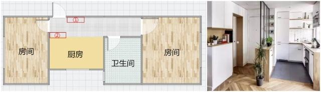 ▲這是非常常見的沒有玄關(guān)的兩室戶型,常見玄關(guān)解決方案如圖所示,方案①如右圖。