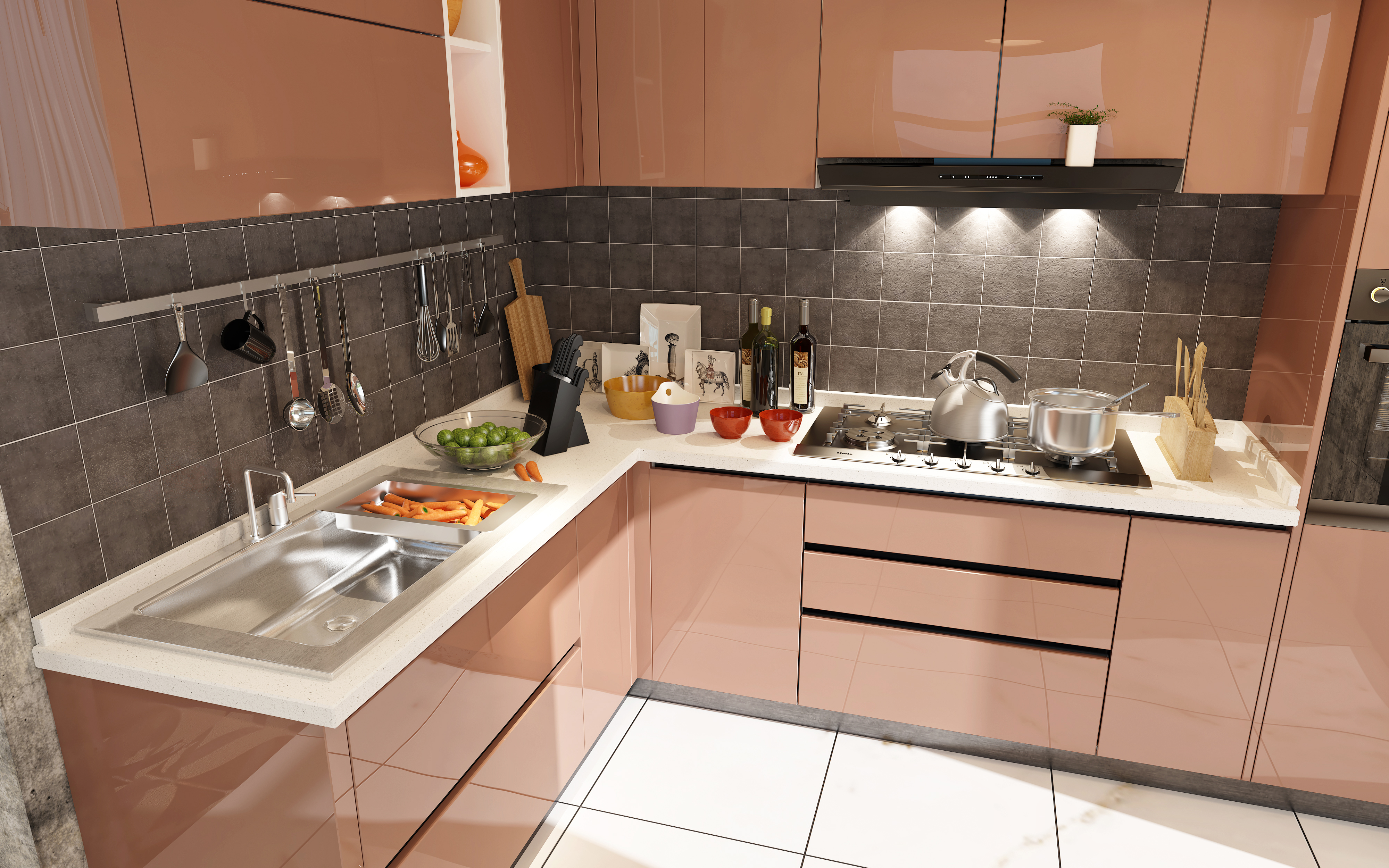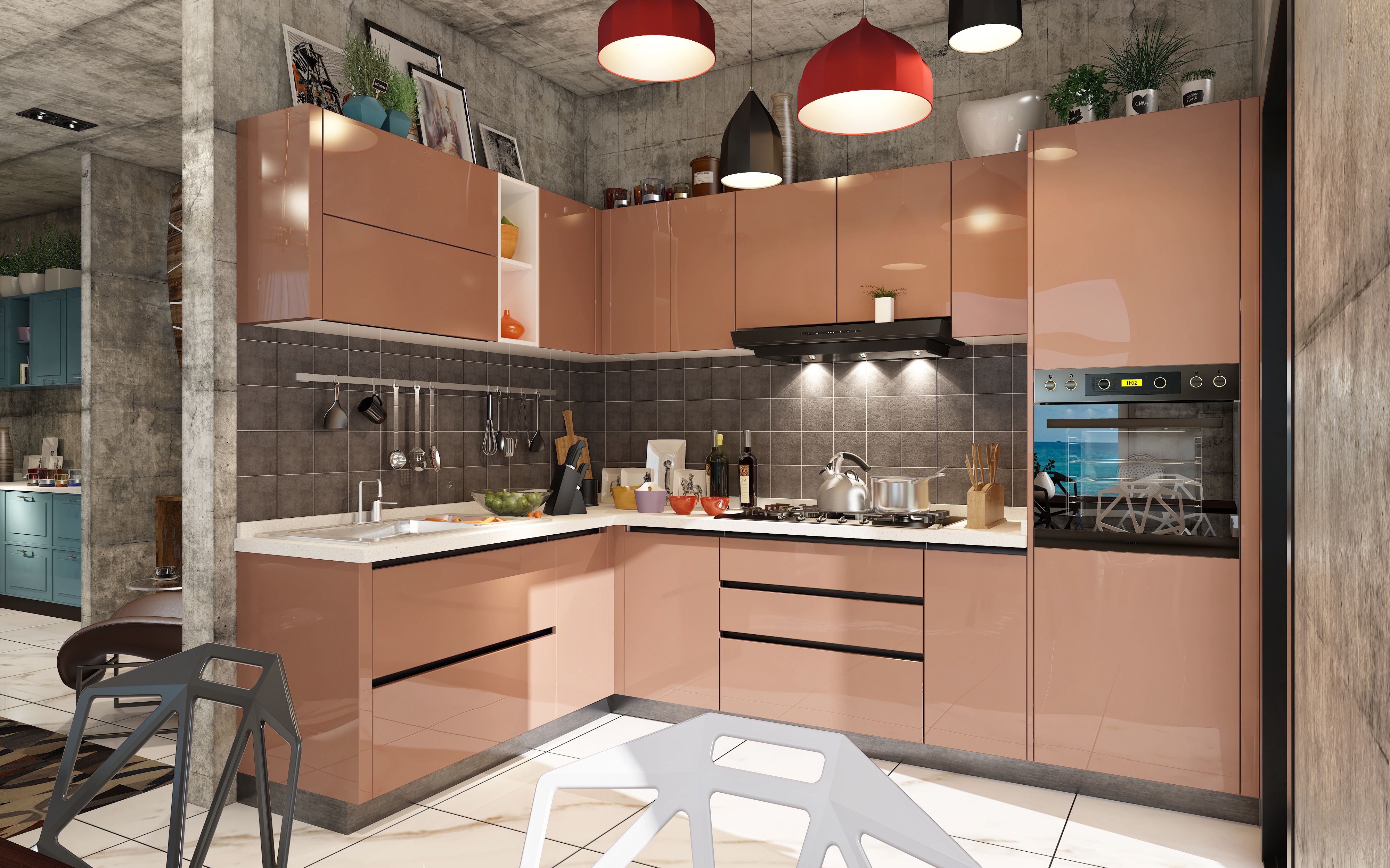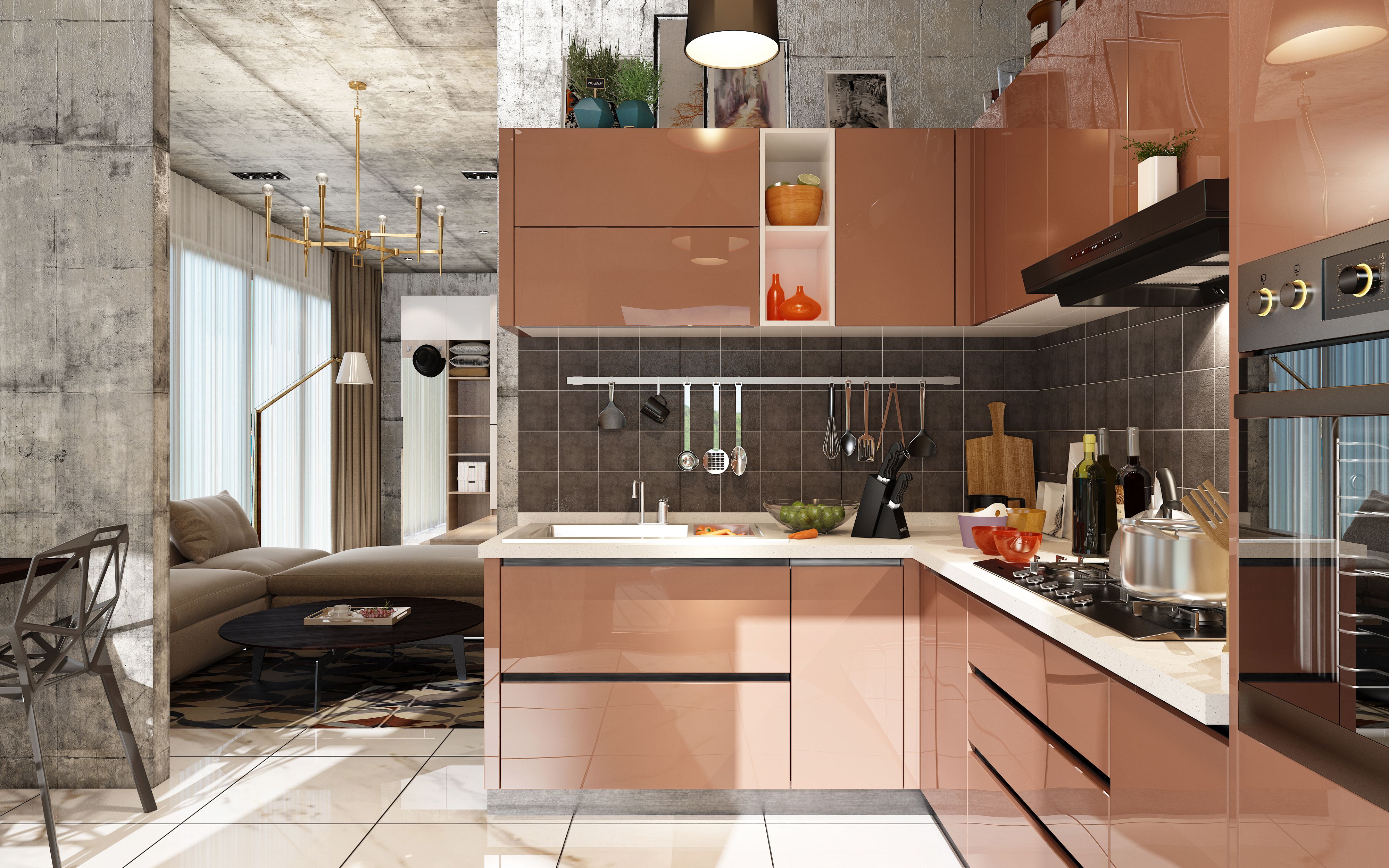 香檳色,充滿夢幻的顏色,在暖光燈的映射下,呈現(xiàn)出自然飄逸的藝術(shù)美感,整體給人明快、潔凈的視覺感受,營造出溫馨舒適的烹飪環(huán)境,生活感十足。