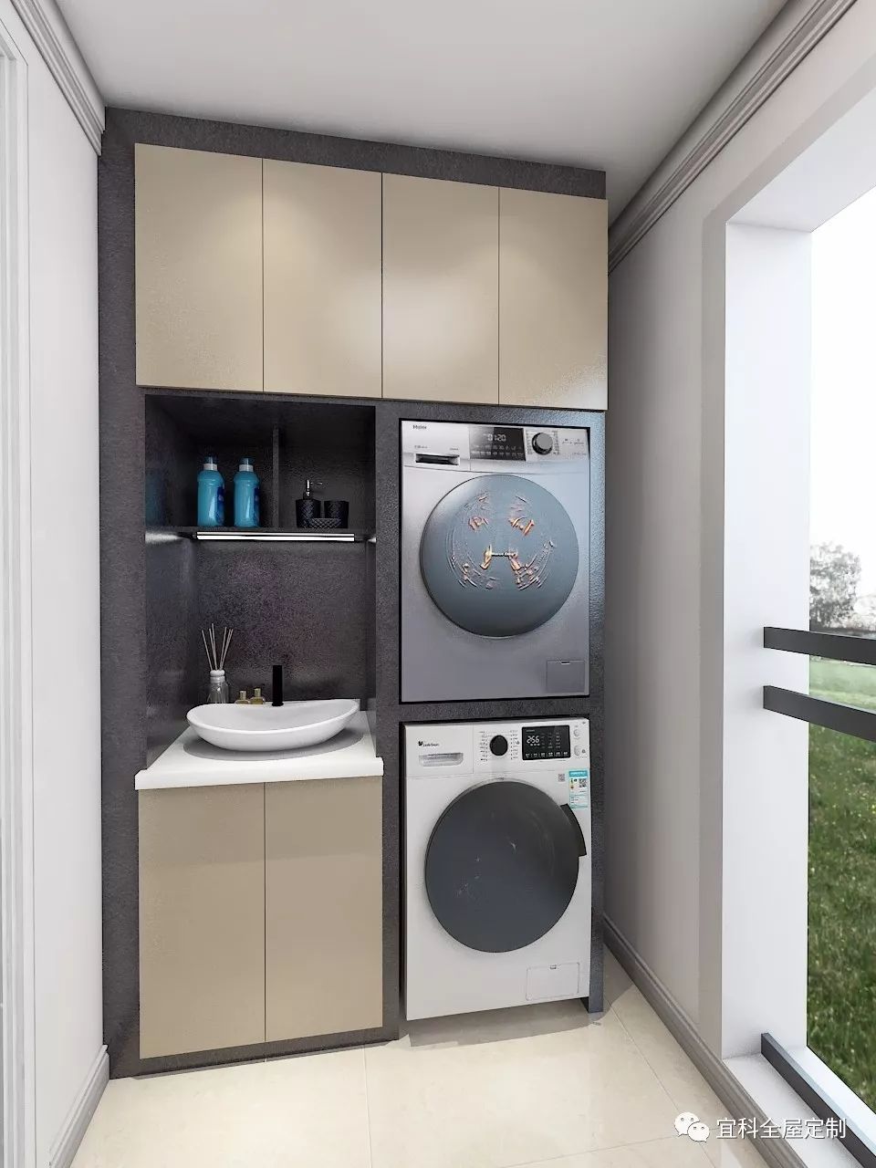 濃郁的生活氣息,在方寸之地的陽臺(tái)一覽無余。陽臺(tái)柜,由沉穩(wěn)的灰石紋和淡雅的杏仁黃兩種元素構(gòu)成,兼具美觀與實(shí)用于一體。一通到頂?shù)脑O(shè)計(jì)整體增加了柜子的容納量,柜體區(qū)間規(guī)劃明確,洗衣區(qū)、烘干區(qū)、洗漱區(qū),收納區(qū)依次排開,絲毫沒有因?yàn)榭臻g的局促而亂了陣腳,充分體現(xiàn)了設(shè)計(jì)者的貼心,和對生活理解的透徹!