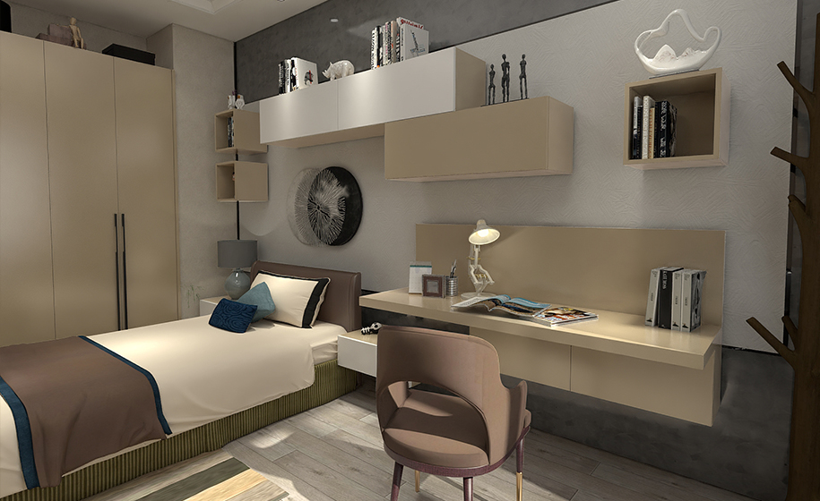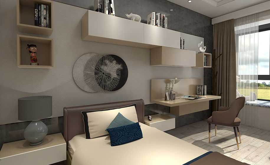 一字型嵌入式床頭壁柜,上下設計大小造型不一的小吊柜,上方放置裝飾小物品,中間鏤空置放書籍,右側(cè)簡約梳妝臺也可做書桌,不僅實用還能提高臥室顏值。床的兩邊兩個懸空式小地柜充當床頭柜,放一盞造型精美的臺燈,在其散發(fā)出的柔美光線所籠罩的范圍內(nèi),隱隱約約的背景墻,加上散發(fā)著油墨香的書籍,頃刻間,生活的曼妙氛圍便溢滿整個居室。