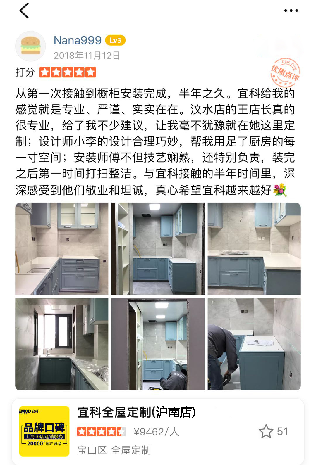 回訪快結(jié)束的時候,客戶告訴我們,他對我們的設計師特別滿意,為了后期產(chǎn)品不出現(xiàn)尺寸上的誤差,光前期的測量設計師小吳就去了好幾次。與水電、墻體等各方的設計師溝通的也很到位,成品出來他特別滿意,在大眾點評的宜科官方平臺,給了我們很高的評價,并且一再表示身邊朋友需要定家具的話會第一時間推薦宜科。