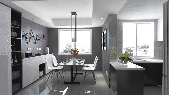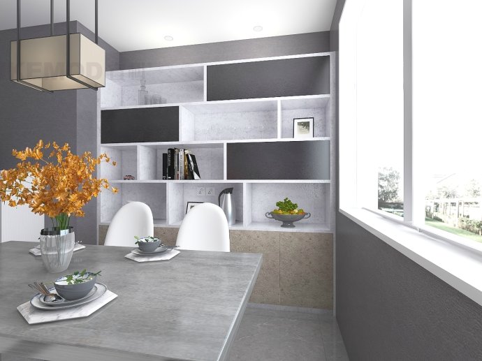 依墻而立的柜子,兼具展示與收納于一體。既可作餐邊柜將平日收藏的精美餐具置于其內(nèi);又能當做酒柜,上吊柜玻璃柜門的選用,通透之余又弱化了空間的逼仄感。而通頂?shù)脑O計手法,既方便的主人日常的清潔,又間接的擴容了柜體的收納量。