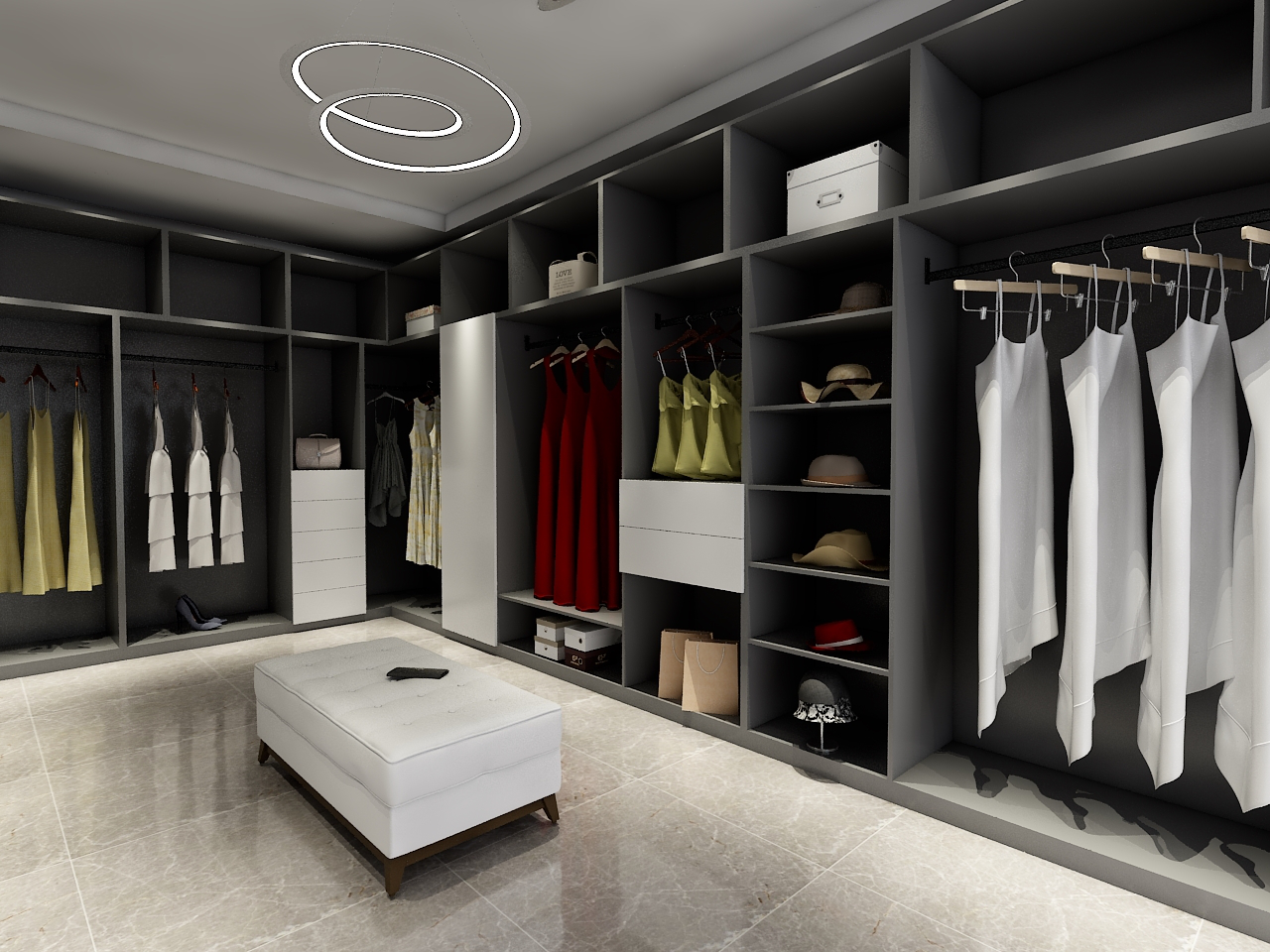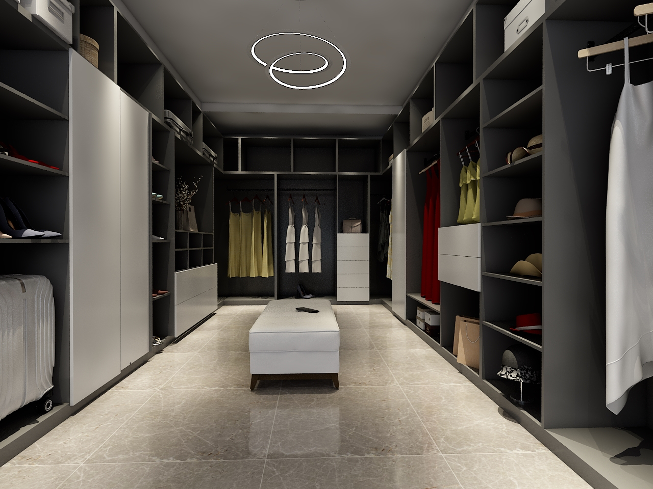 U型衣帽間,以灰色為主,白色為輔。灰的輕奢質(zhì)感,白的典雅高貴,結(jié)合頗具時尚感的環(huán)裝吊燈,用心打造出令每一個女性都夢寐以求的、女王般的換衣體驗!