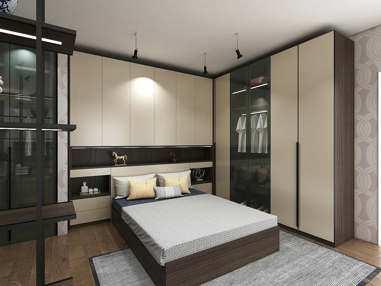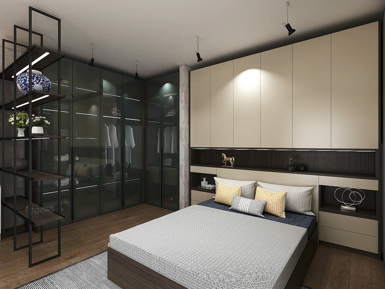 主臥設(shè)計,是整個家中的一大亮點,不拘常規(guī),獨創(chuàng)新意。由開放式衣帽間、兩組到頂衣柜拼接而成的L型收納區(qū)、休憩區(qū)三大核心區(qū)域構(gòu)成臥室空間。超大容量的儲物空間極大的滿足了女主人的儲物需求。