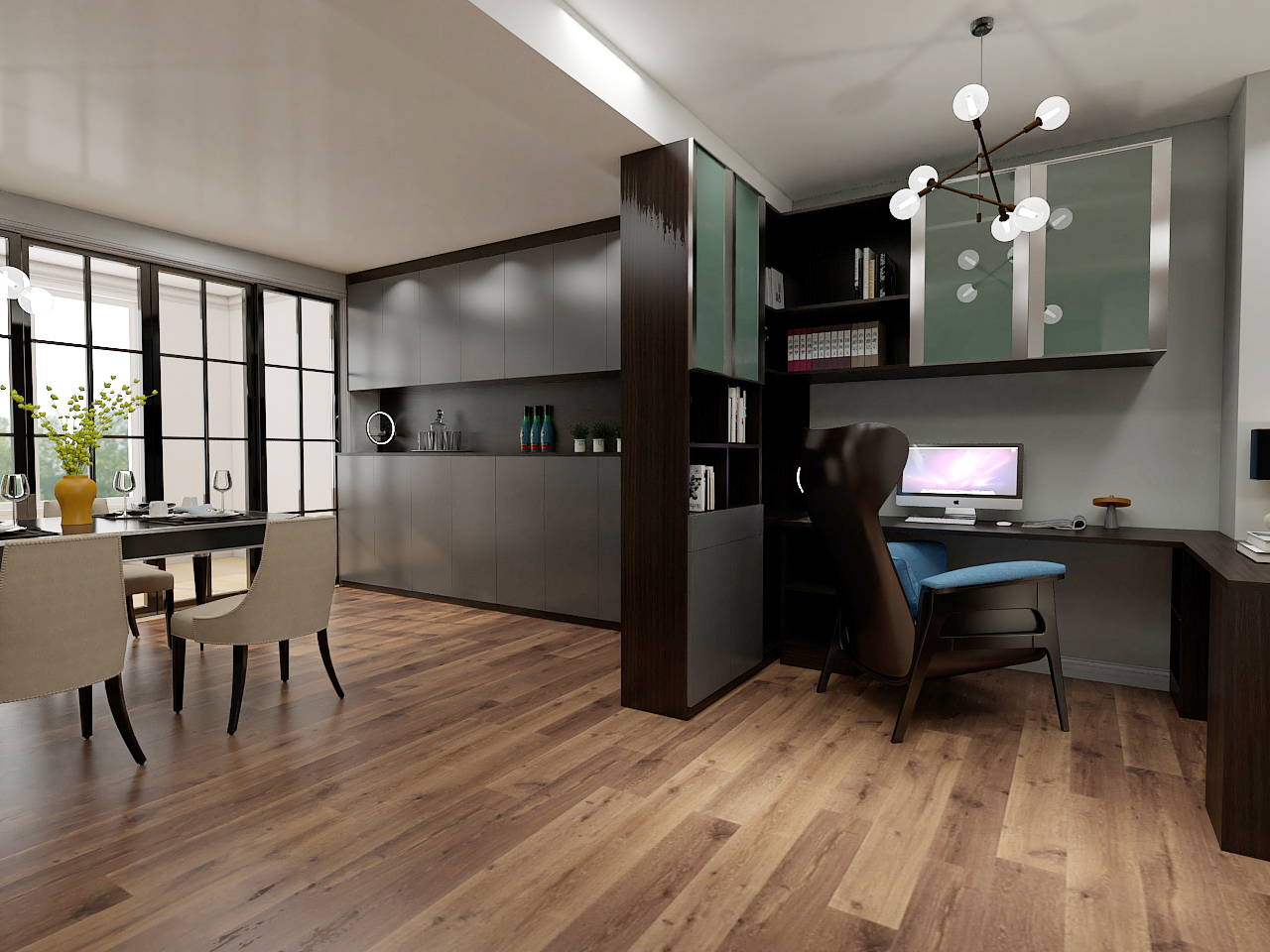 去除壓抑空間的吊頂,擴張視覺領(lǐng)域。以L型柜體為隔斷,劃分出用餐、閱讀的兩處空間,以定制家具的多功能性定義空間屬性。