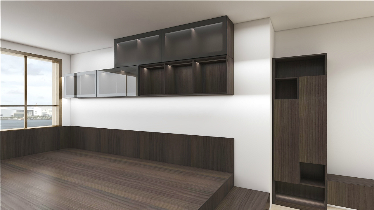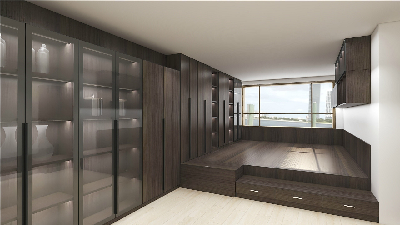 榻榻米,由跪坐衍生出的居家物品,以其的強大多功能性而備受年輕客群的喜愛。采用上乘的鋼化玻璃與摩柯黑森的柜門,通透之余,兼顧私密。