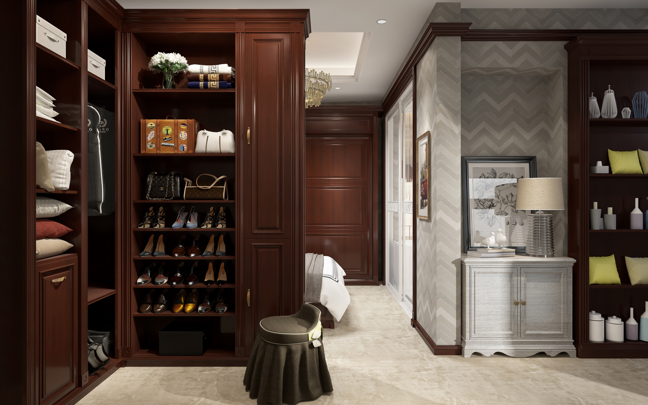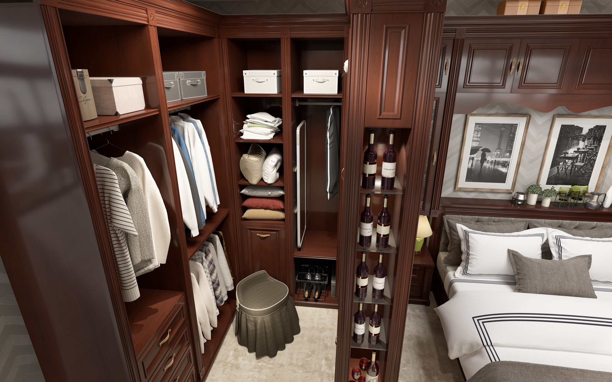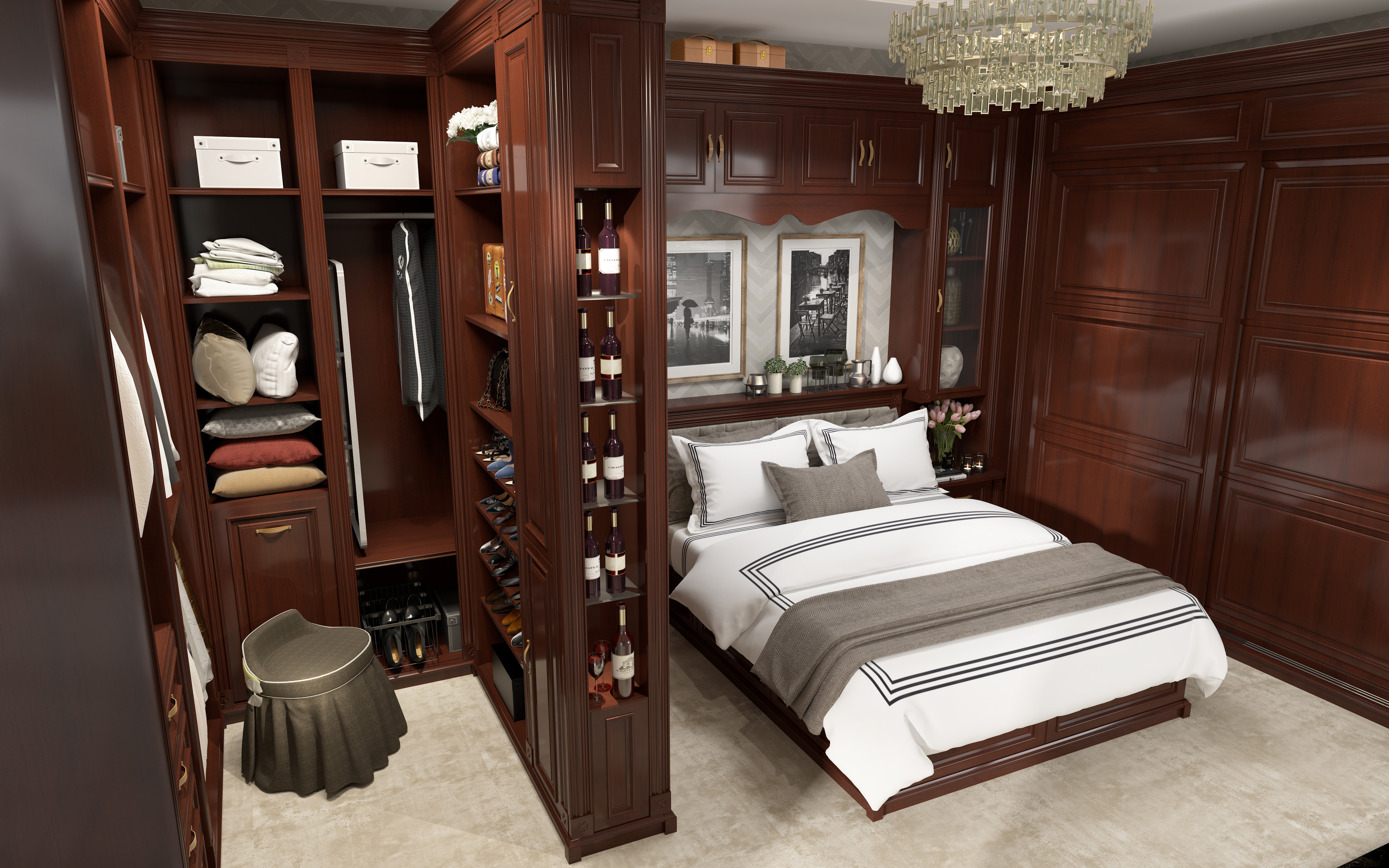 動線設(shè)計,行云流水。隔斷式置物架,將有限的空間一分為二,一側(cè)休憩,一側(cè)更衣。擱板改造的收納空間,將每一層、一格的用途明晰標(biāo)記。精美華麗的燈飾與端莊典雅的家具相映成趣,在溫暖的燈光里,小酌佳釀,愜意的享受屬于一個的美好時光。