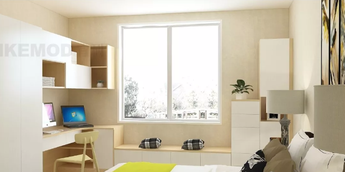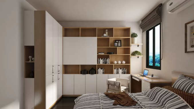 根據(jù)空間的尺寸定制整體衣柜,可以大大提高臥室的使用率,還可以加入梳妝臺、書桌等功能。