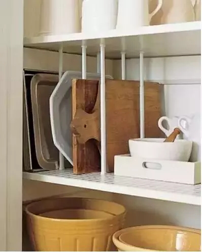可曾想到用掛桿來收納砧板、烤盤?用了掛桿,這些大件可以在最少的空間里最好地收納,方法不錯吧。