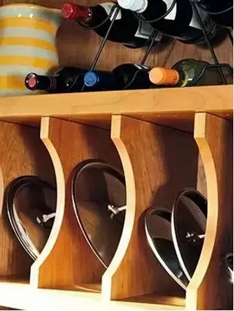 采用垂直收納方案,將各種鍋蓋與鍋分開。每個鍋蓋放在一個格子里,使用時也很方便拿取。
