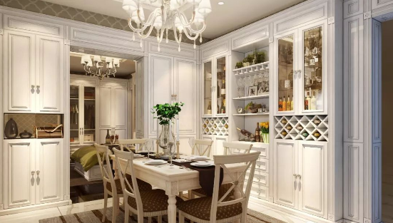 餐廳成長(zhǎng)方形,由于一面墻太過(guò)狹隘,所以用一個(gè)圓弧柜將兩面墻的柜體連接了起來(lái),這樣能夠增大了收納空間,更能利用弧位的特別造型做裝飾柜,不會(huì)占用太多的空間,也可以起到更好的裝飾效果。