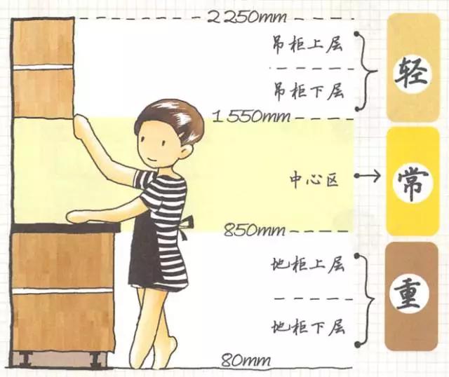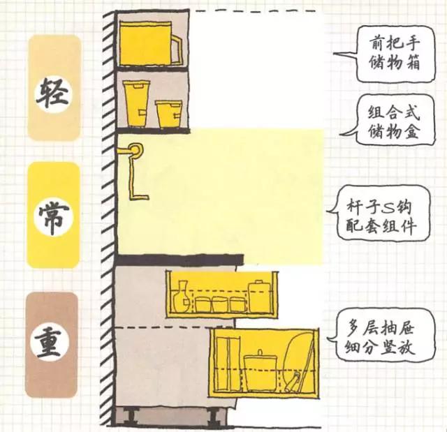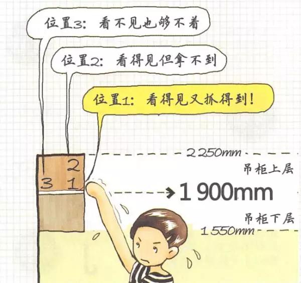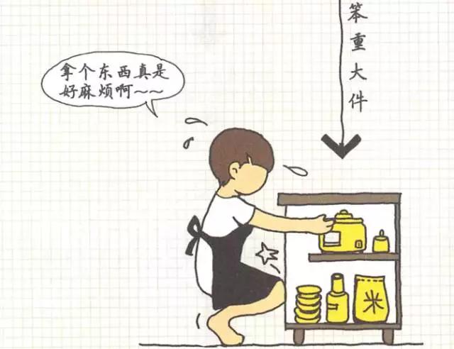 這里是寸土寸金,無(wú)論是廚具、電器還是調(diào)味品,如果不是每天,每噸頻繁使用的話,請(qǐng)不要占用這塊寶貴的區(qū)域;這個(gè)區(qū)域的關(guān)鍵詞是--常