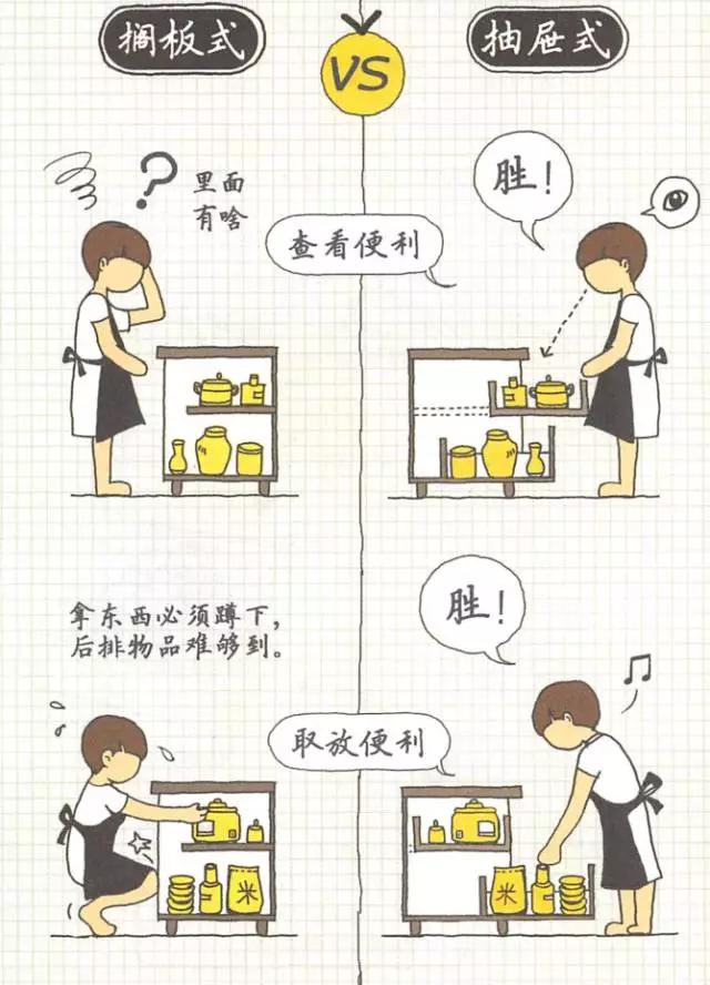 看完上圖,是不是瞬間就知道抽屜為啥是第一推薦了呢!但是抽屜不便宜!如果預(yù)算不是很足的話,可以在黃金區(qū)加入抽屜,優(yōu)化櫥柜的利用;