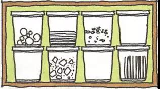 比較兩圖,圖二將物品拆除原包裝,轉(zhuǎn)入統(tǒng)一規(guī)格的容器,有效地使用立體空間,杜絕空間浪費(fèi),吊柜實(shí)際可用容量自然大增。