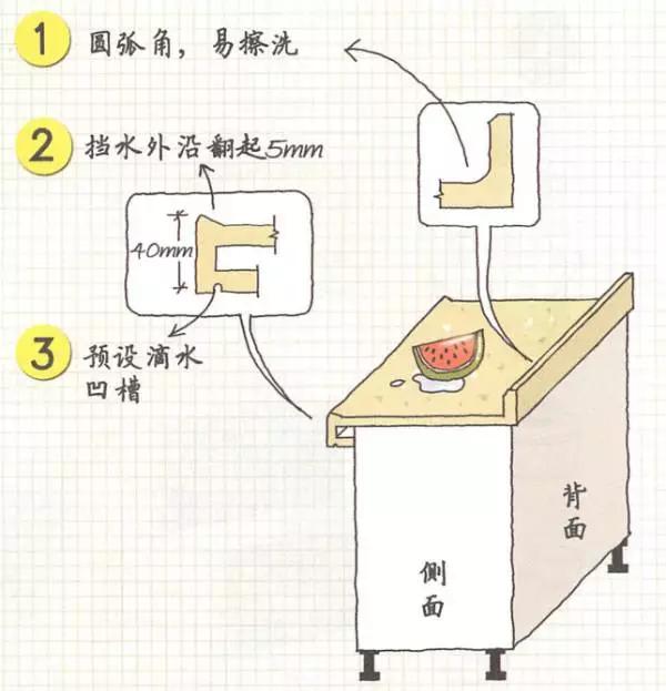 臺(tái)面材質(zhì)選擇,需考慮耐污易清潔的,不建議選擇淺色臺(tái)面;