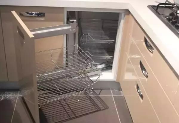 這種設(shè)計(jì)不少見,也利用了轉(zhuǎn)角的空間,事實(shí)上,這樣的設(shè)計(jì)真的是又貴,利用率又低,只能放小件物品,鍋碗瓢盆一個(gè)都放不下。所以,良心推薦就是拉籃!