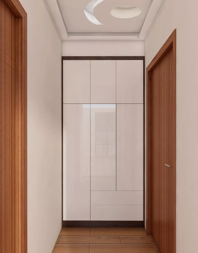 主、次臥間以通道相隔,進門正對通道盡頭,這類戶型布局在普通老百姓家中也較為常見。以本案為例,業(yè)主為了保持開放式客廳的風格一致,將玄關柜設立在通道盡頭,為不破壞回字頂?shù)囊曈X美感,以不到頂?shù)氖址ㄔO計柜體。