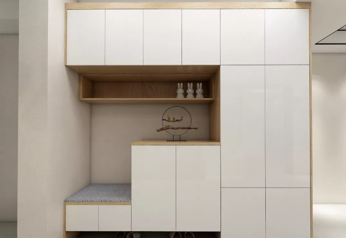 整體式玄關柜,以傳統(tǒng)衣柜打底,在其基礎上做略微改動。上圖玄關柜,采用貼頂式設計,擴容收納,以兩側封板為支撐,抬高柜體,使底部懸空,確保房間的整潔度不會被凌亂的鞋子破壞。局部柜面,以玻璃增加透光度。