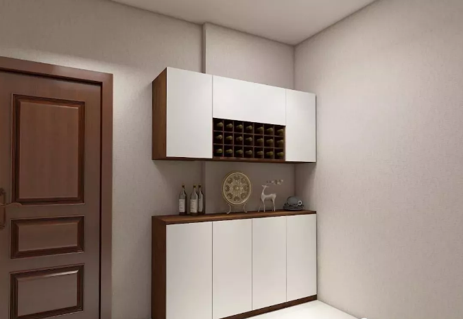 平行式玄關柜,上為吊柜,下是地柜,兩組柜體中部懸空、平行排列,也是比較常見的大眾玄關設計之一。而這位客戶則將上吊柜部分區(qū)域改為儲酒區(qū),以菱形柵格式對外開放,為角落風景增色不少。