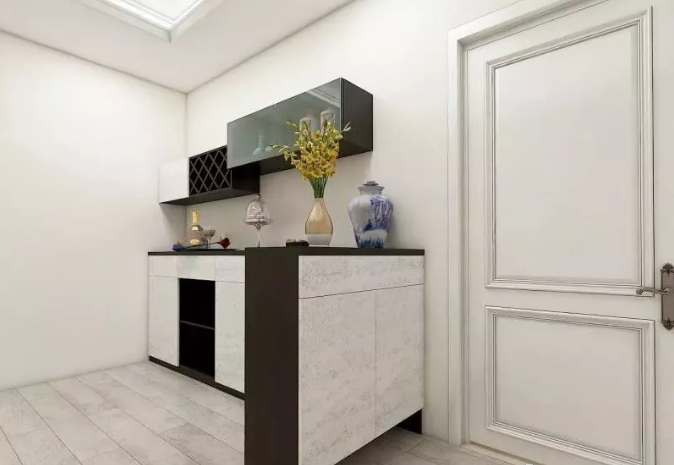 適用于大戶型的L型玄關設計,用入戶玄關與餐邊柜的家具實物,將兩側墻體立體連接,在同一區(qū)域,同時實現(xiàn)兩種功能。