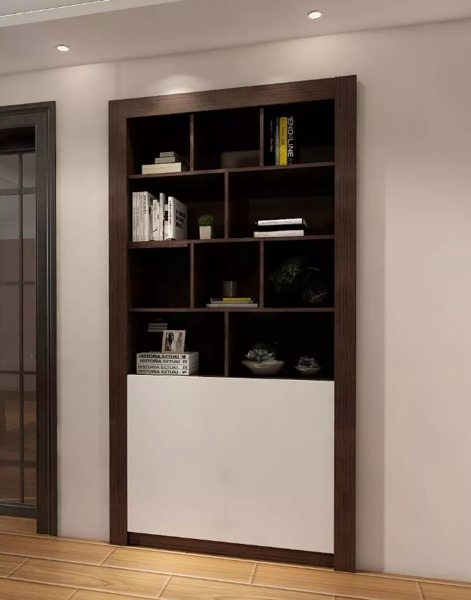 以四周封板為框架,上下各用吊柜鑲嵌,中部以框型結構做填充,來劃分收納展示區(qū)域。用灰色作跳色,增加質感。這種為了保持柜體連貫性的完整性設計,迎合了多數(shù)客戶以實用為主、兼顧顏值的消費理念。