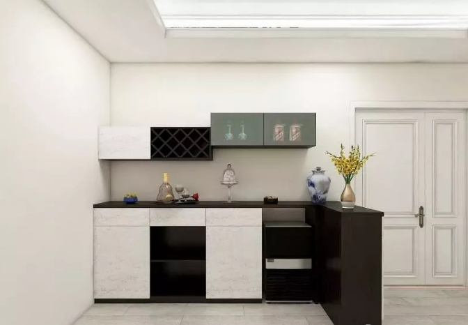 拼接柜體的L型設計,以內(nèi)外結構劃分功能區(qū)域。進門外側為玄關矮柜,方便進門換鞋的第一動作,內(nèi)為用餐區(qū),上方墻體,兩組吊柜錯落排開,彌補了空白墻面的單調(diào)。這種針對小戶型設計的多功能組合柜,有效解決了空間不足的問題。