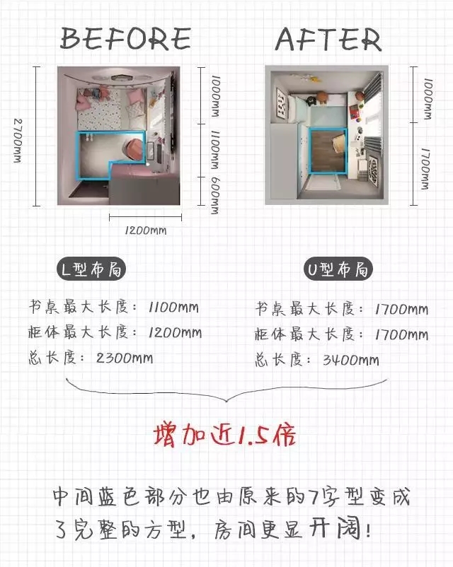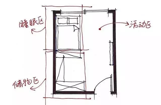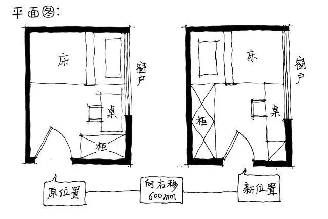 ▲將門的位置向中間移600mm,這樣門后的空間也可以利用起來,變成了穩(wěn)定的可擺放家具的區(qū)域。